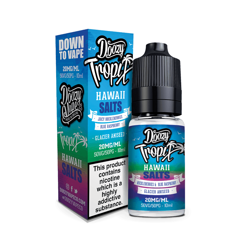 Doozy Tropix Hawaii Nic Salt E-Liquid. A Tantalising mix of Juicy Huckleberries and Blue Raspberry with a hint of Glacier Aniseed. A fresh fruity taste with a nicely balanced Cool aftertaste. This Berry unique concoction will have your taste buds tingling with delight.